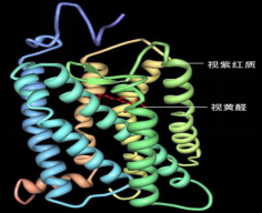 在眼睛视网膜的每个感光细胞里,这种叫视紫红质的蛋白质特别丰富。更有说服力的是,当光线照射进来的时候,视紫红质就会褪色,与此同时,它会在视网膜细胞里产生一个微弱的生物电信号。所以你看,这样一来,环境里的光信号,就被转变成了生物体内的一种电信号”“到了20世纪,美国科学家沃德(George Wald),更是帮助我们彻底理解了变色和感光的化学本质。他发现,视紫红质这种蛋白质之所以会有颜色,是因为它平时会和一个叫视黄醛的小分子结合起来”