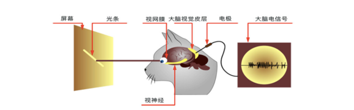 我们已经知道,光点在视网膜上是怎么被感觉到的。简单来说,光通过晶状体折射,照到哪里,哪里的感光细胞就会出现电信号。1958年,两个三十出头的神经科学家休伯(David Hubel)和威瑟(Torsten Wiesel),在合作研究动物是怎么看到光点的”